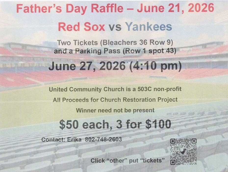 Raffle tickets can be purchased for $50 each or a book of 3 for $100. Tickets are available through the QR code on the poster (left), contacting the church office at 802-748-2603 or email: Unitedcommunitychurchucc@gmail.com